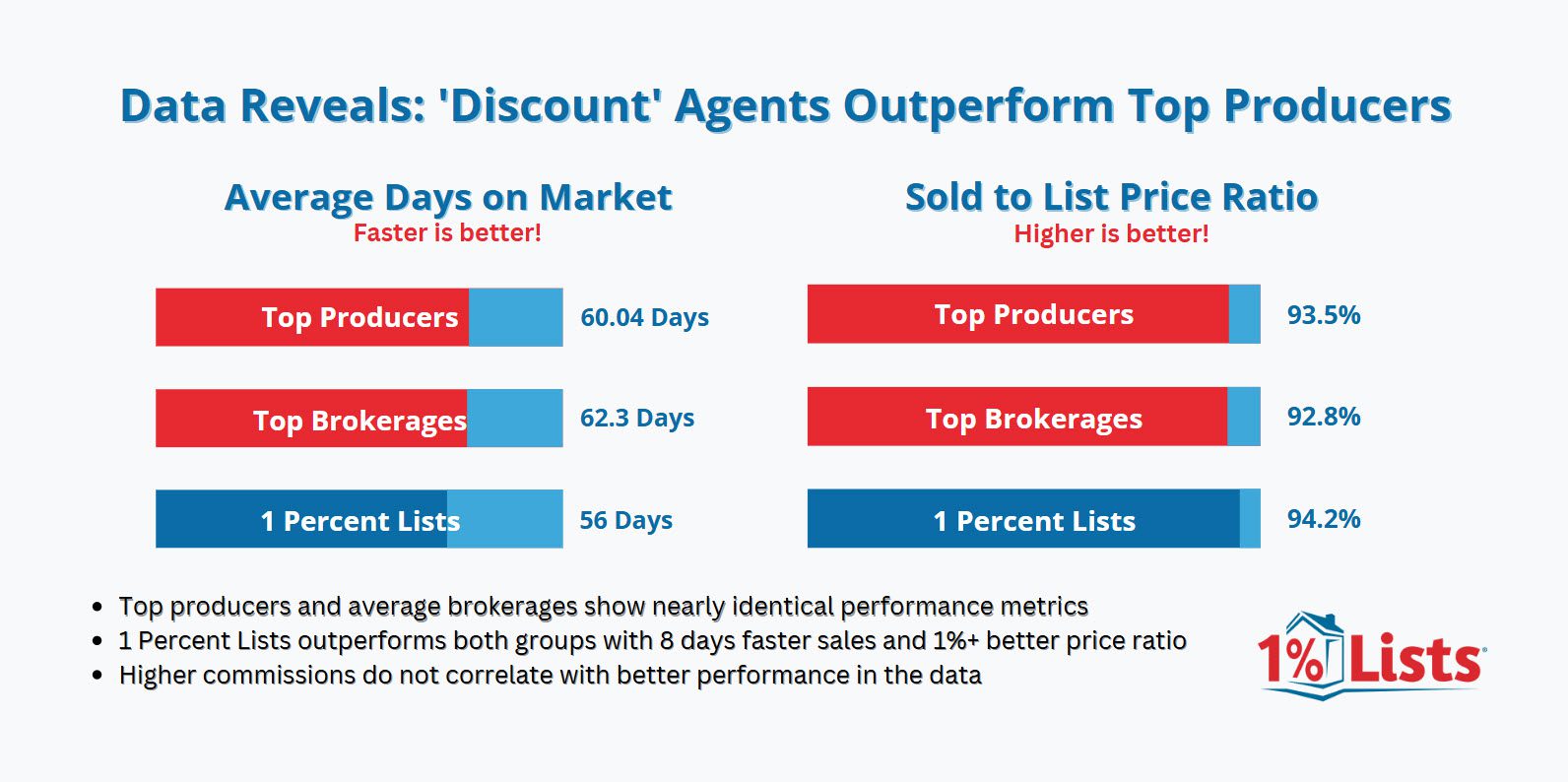 I recently completed a study using Marketview broker data that revealed something interesting: “discount agents” like us at 1 Percent Lists sell homes faster and for a higher price-to-original-list ratio than our more expensive competitors. This discovery led me to a bigger question: Do top producers outperform the average real estate agent across the board?